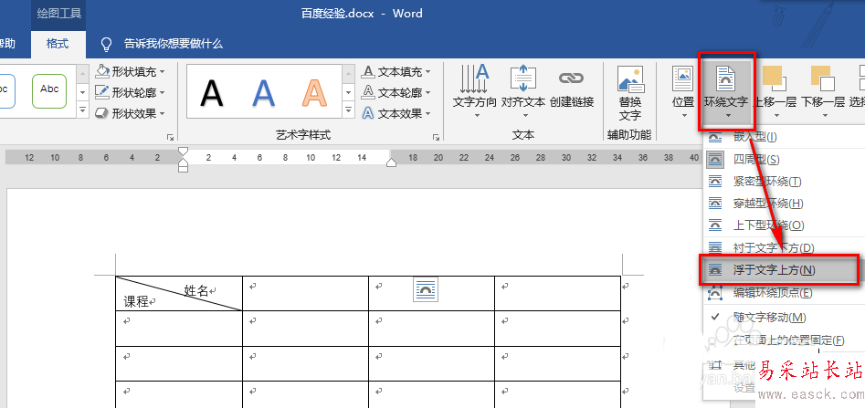 8、用鼠標將文本框拖拽到合適的位置,你會發現文本框并沒有漂浮在文字上方。在繪圖工具中,環繞文字,設置為“浮于文字上方”