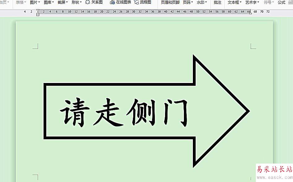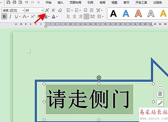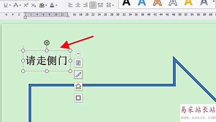 6、在藝術字文本中輸入箭頭標識語,如“請走側門”;