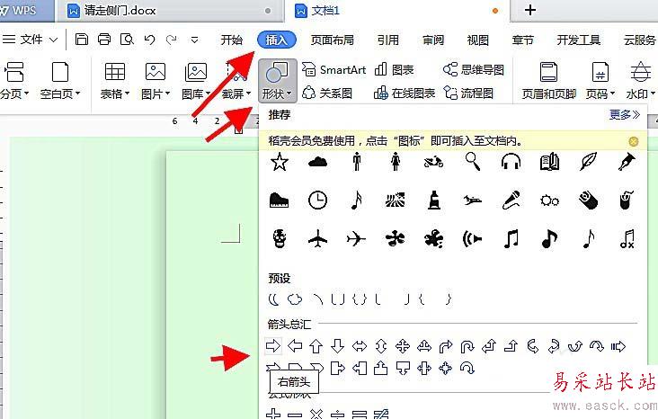 2、在工具欄選擇“插入---形狀”,在形狀中選擇“箭頭匯總”在其中選擇適合自己的箭頭;