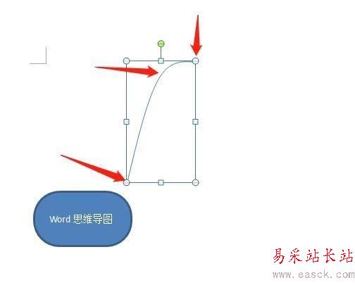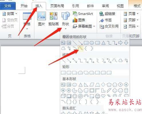 4、再點擊插入選項卡,形狀功能里的曲線。如圖,在紅箭頭所示按順序點出三個點,繪制出曲線。