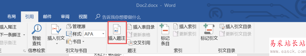 3、切換到引用選項(xiàng)卡之后,還要在引用選項(xiàng)卡內(nèi)找到題注組選項(xiàng),找到之后點(diǎn)擊題注組中的插入題注按鈕。