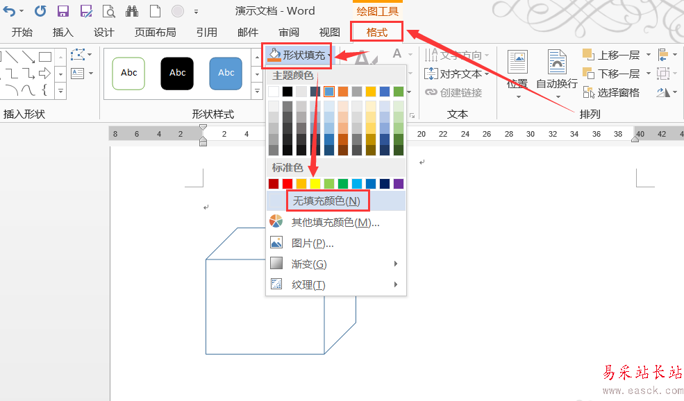 5、切換到繪圖工具“格式”,在下面找到“形狀填充”,去掉圖形中填充的顏色。