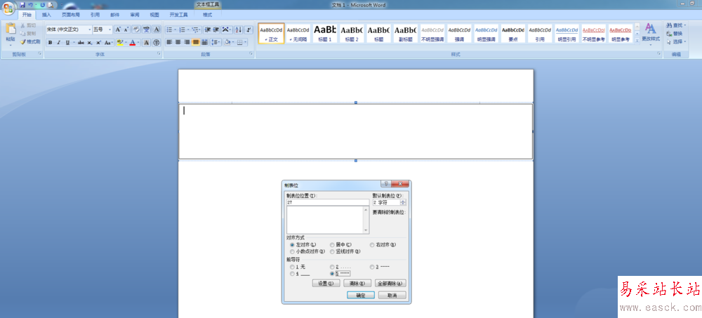 2、進入「開始」-「段落」-「段落設置」-「制表位」,在位置中輸入“27”,然后選擇一種前導符,確定