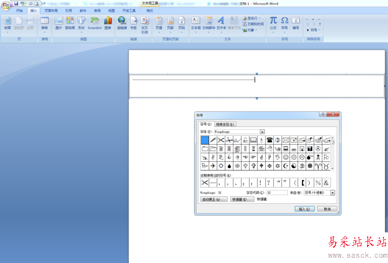 4、下面我們來插入一個剪刀,進入「插入」-「符號」-「符號」-「其他符號」,將字體選擇為「Wingdings 」