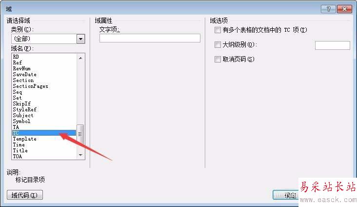5、在TC域域屬性文字項窗口中,在框中輸入要成為目錄的文字,點擊確定。