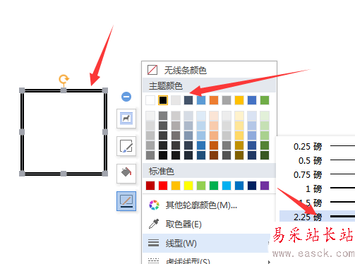 1、打開文檔,使用【插入】——【形狀】——【矩形】畫一個正方形,并設置輪廓線為【黑色】,線型為【2.25磅】,填充色為【無色】或者【白色】。如下圖所示。