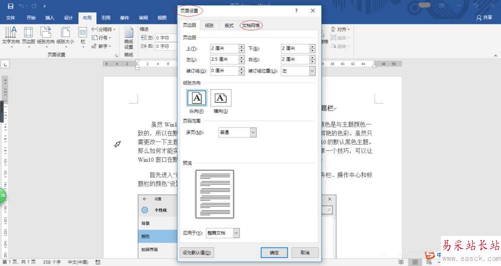 4、彈出"頁面設置"對話框,如圖所示。選擇"文檔網(wǎng)格"標簽,下步將進行設置文檔每頁最多可輸入的行數(shù)操作。