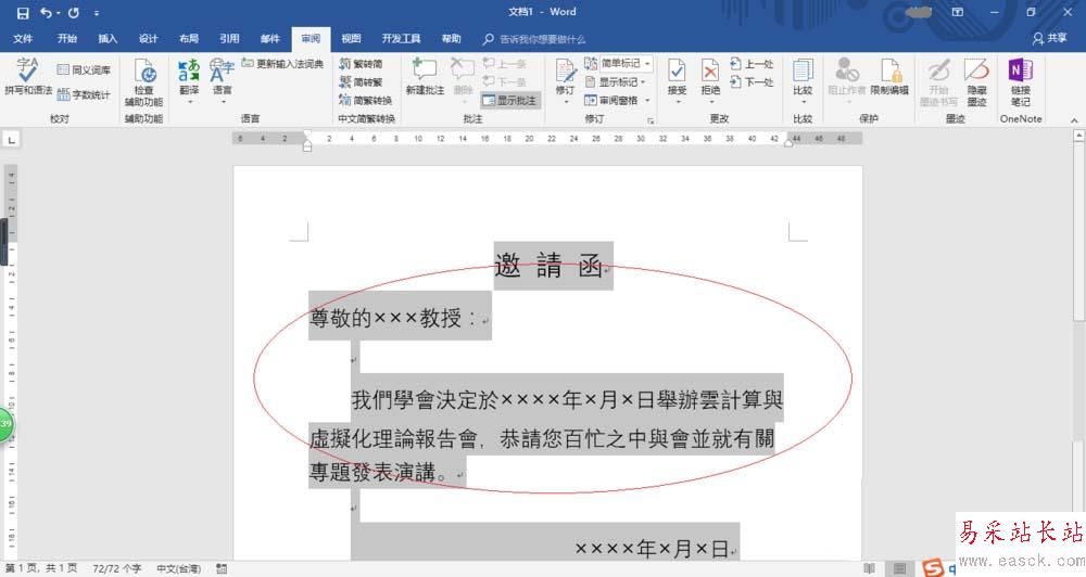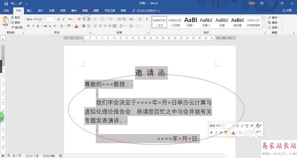 3、如圖所示,全選邀請(qǐng)函文檔內(nèi)容。選擇功能區(qū)"審閱"標(biāo)簽,下步將進(jìn)行繁體邀請(qǐng)函的制作。