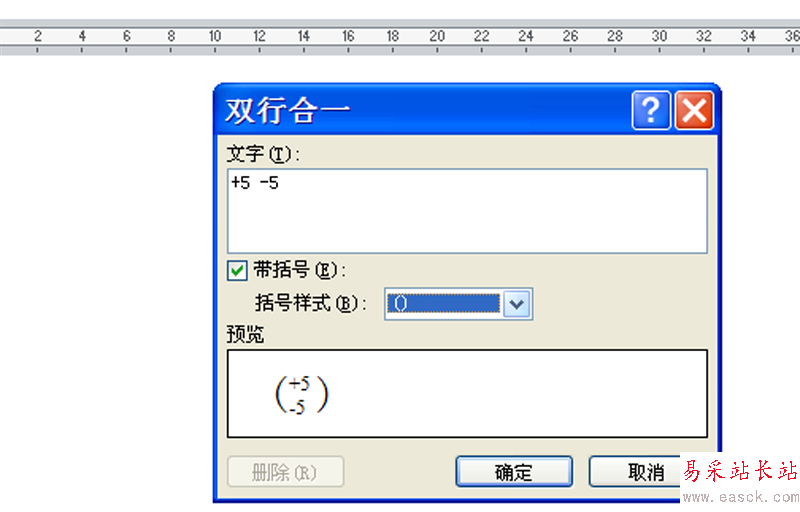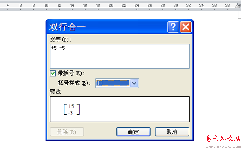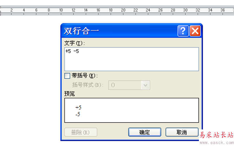 3、在雙行合一對話框窗口中,設置文字中內容之間添加一個空格。