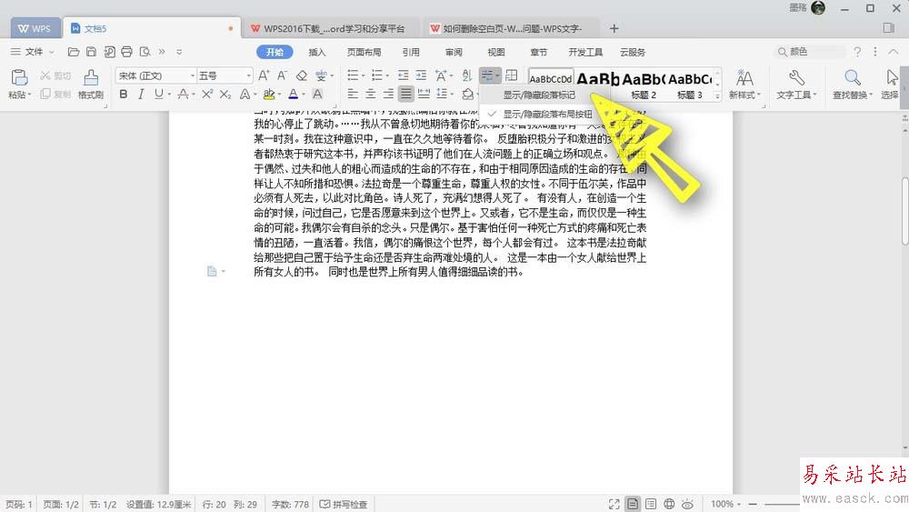 1、如果文檔多了一個空白的頁面,而我們無法刪除的話,我們可以點擊頁面上方的顯示或者隱藏編輯標記,如下圖所示,