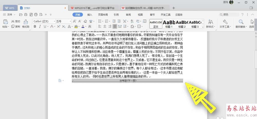 3、我們可以在文檔中看到,因為段落下方多了一個分節符,所以導致我們無法刪除下一頁,我們使用鼠標左鍵選中這一個分節符,然后按鍵盤上面的刪除鍵,把分節符刪除了,如下圖所示,