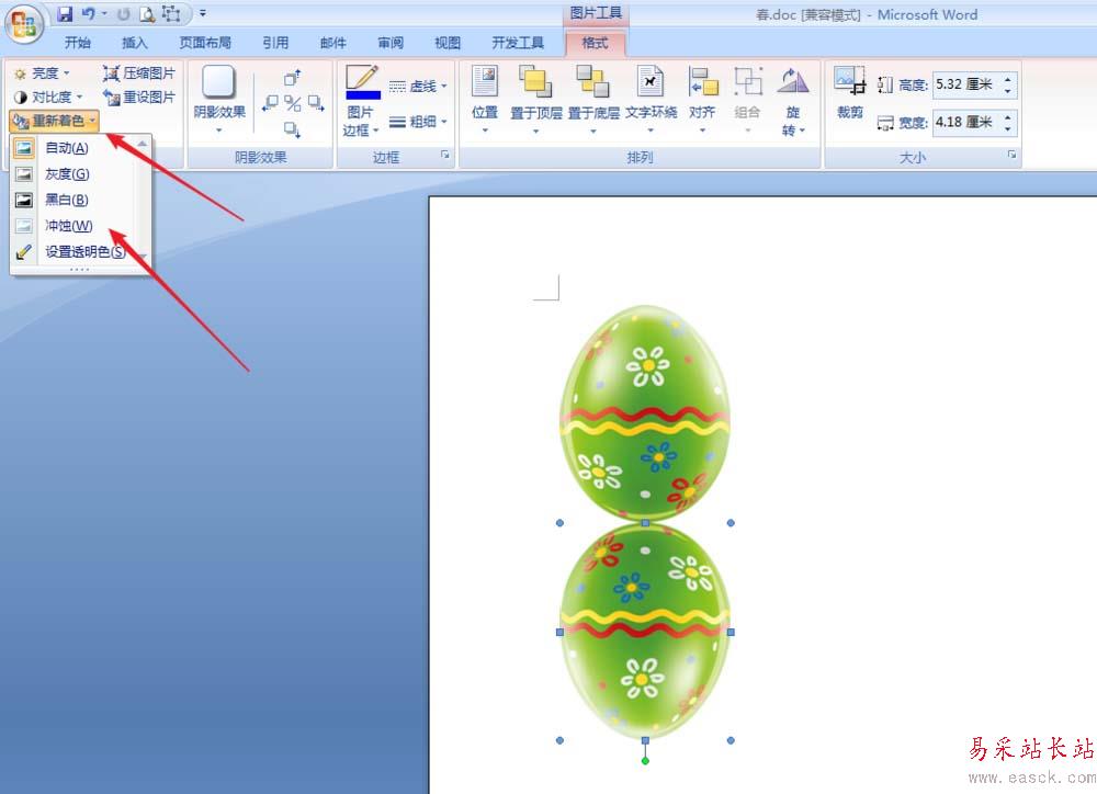 6、選定下面的圖片,點擊上方的“圖片工具”--“格式”--“重新著色”--“沖蝕”。