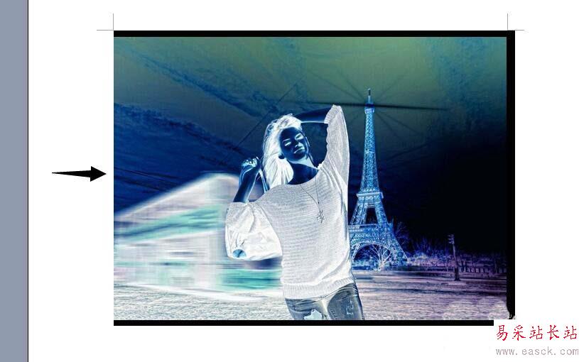 2、在圖片的左邊空白位置處(圖中的箭頭所示位置),單擊鼠標左鍵。我們發現,照片被選中了。而且,現在照片已經就是底片(反相)效果了。