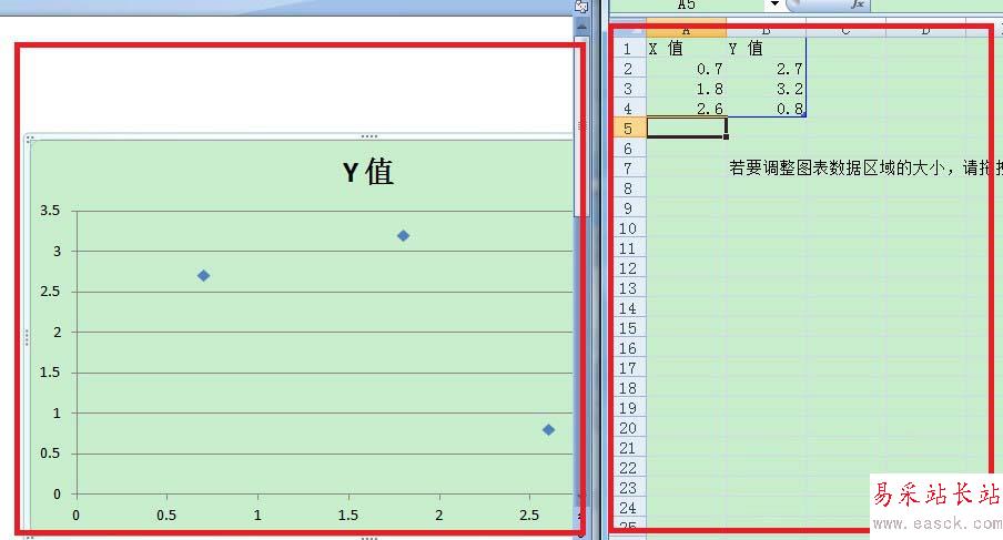 2、這是頁面會彈出兩個窗口,左側是用word來顯示我們即將插入的散點圖,右側是用excel表格來修改散點圖中的數據