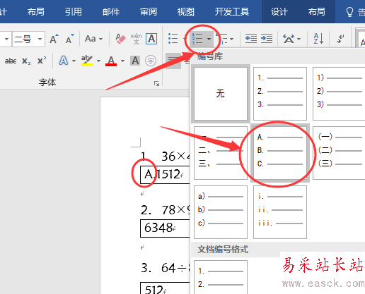 5、點擊【開始】選項卡中的【編號】,為表格中的答案選項添加編號