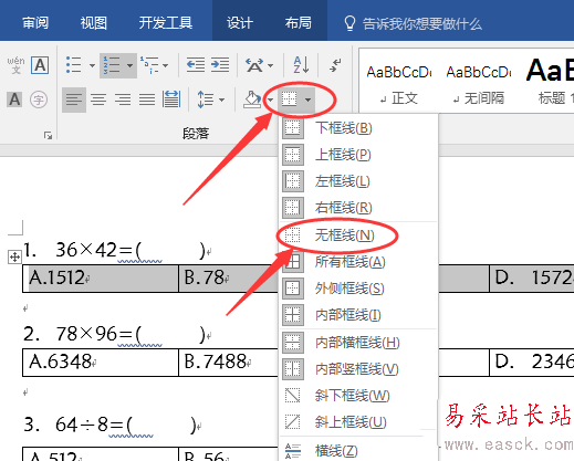6、最后只要選中表格,然后點擊【開始】-【段落】-【邊框】,選擇【無框線】即可