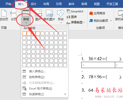 2、點擊【插入】-【表格】,在題目的下方插入表格(根據(jù)實際題型答案的不同插入不同的表格)