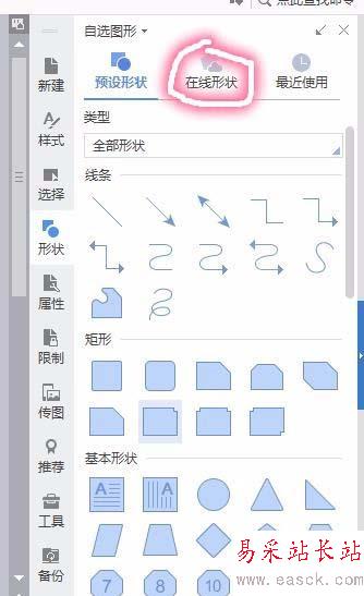 5、點擊“在線形狀”可出現很多不同的形狀
