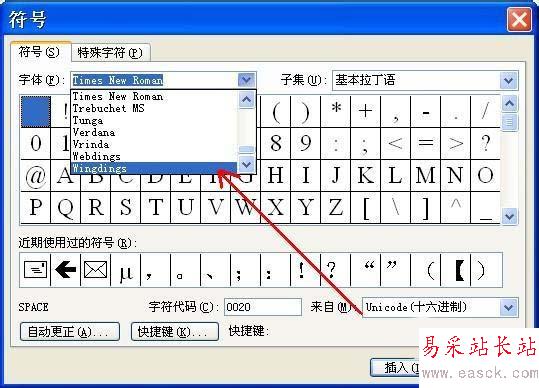 3、在字體一欄,下拉菜單,選擇“wingdings”。