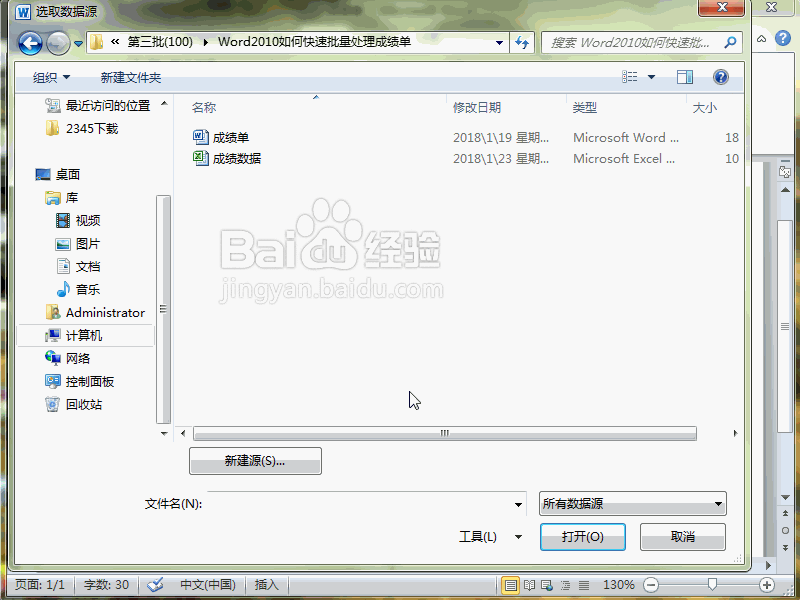 3、彈出選取數(shù)據(jù)源對話框,找到并點擊第一步保存的Excel成績數(shù)據(jù)表,點擊對話框中的打開按鈕。