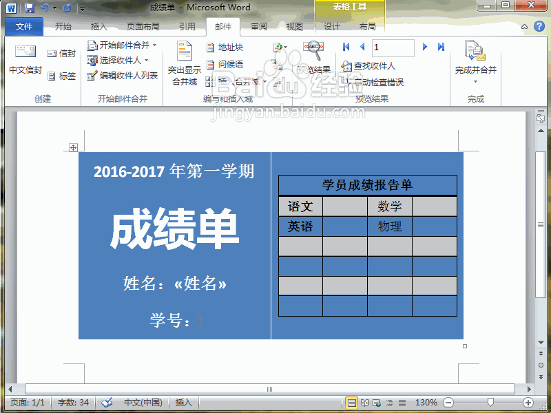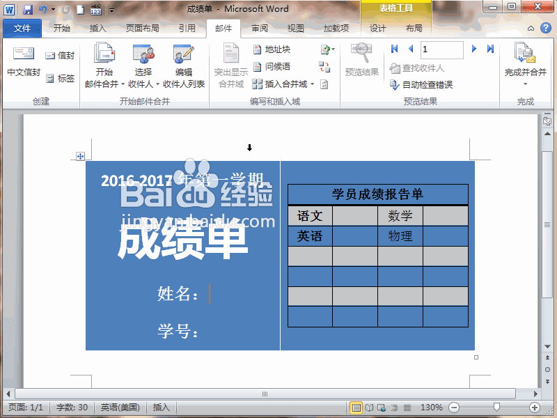 2、接下來,打開Word2010,設(shè)計好成績單的界面。然后點擊郵件選項卡,在開始郵件合并功能區(qū)點擊選擇收件人,在彈出的菜單中點擊使用現(xiàn)有列表。