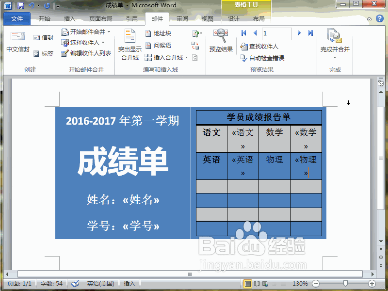 7、最后點擊完成功能區(qū)中的完成并合并,點擊編輯單個文檔,在彈出的對話框中點擊確定按鈕,所有學(xué)員的成績單就出來了。