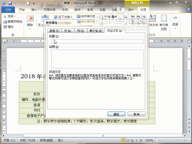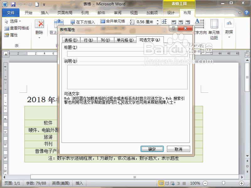 3、彈出表格屬性對話框,點擊可選文字選項卡,把光標定位在標題下方的文本框里。