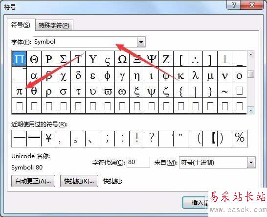 3、這時就會打開符號窗口,在字體下拉菜單中選擇Symbol菜單項,然后就可以看到π的符號了,選中后再點擊右下角的插入按鈕就可以了。
