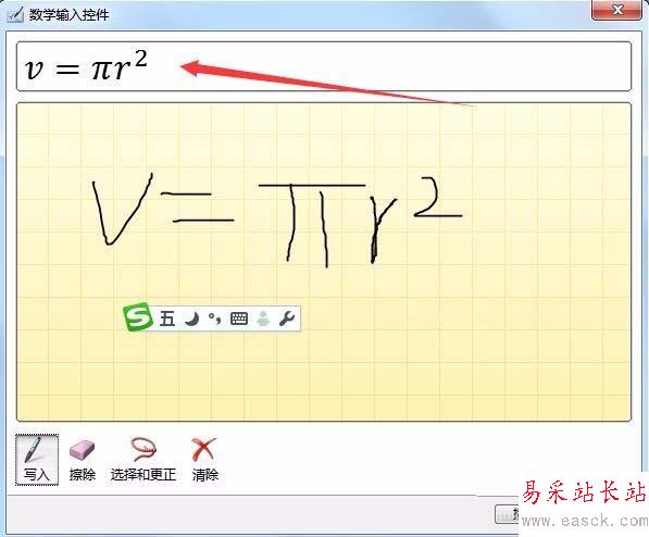 4、這時就會打開數(shù)學(xué)輸入控件,在這里用鼠標(biāo)書寫公式即可,書寫完成后點擊下面的插入按鈕。