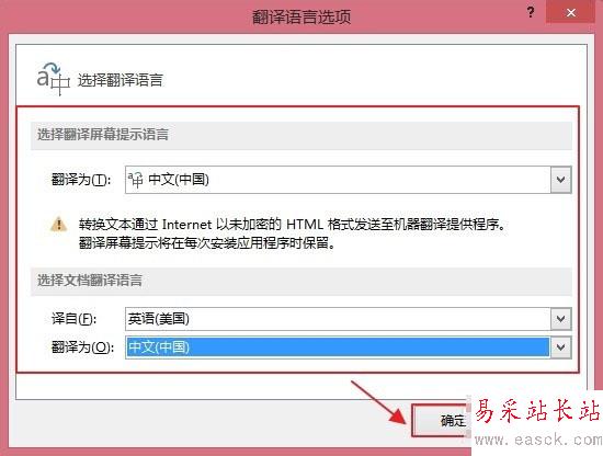 2、打開“翻譯語言選項”對話框,根據需要設置文檔的翻譯語言,然后單擊“確定”。