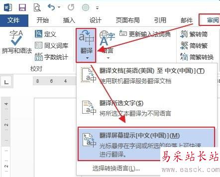 (1)在“審閱”選項卡“語言”組單擊“翻譯”,在展開的列表中單擊“翻譯屏幕提示”,啟用該功能。