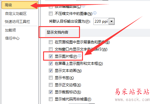 6、拖動(dòng)界面,找到下圖位置。可以看到在顯示文檔內(nèi)容一欄,顯示圖片邊框前面已被勾選。此時(shí),我們要去掉勾選。