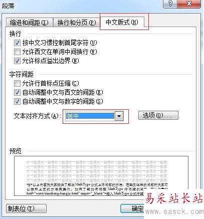 2、選擇“格式”——“段落”——“中文版式”,將“文本對齊方式”改為“居中”即可。