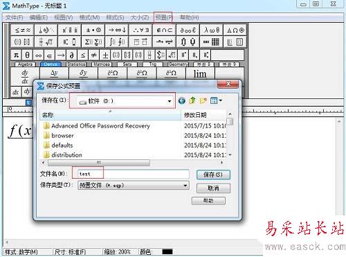 2、點擊“預置”——“公式預置”—— “保存到文件”,存一個與默認配置文件不同的名字,比如“Test”然后關閉Mathtype回到Word文檔。