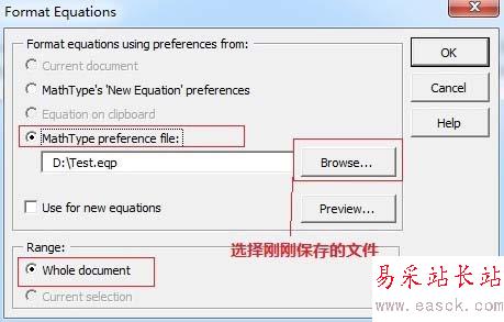 3、點擊Word界面上的“Mathtype” ——“Format Equation ”—— MathType preferrencefile選項下面的“browse”按鈕,選中剛才存的配置文件“Test”,點選“Whole document”選項,點OK,就安心等著公式一個個改過來。