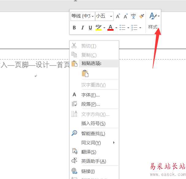 4、完成后有時后面的頁腳頁眉因默認內容也會存在內容,因此需要刪除后面內容。其中頁眉的線最為難刪除。此時點中頁眉,會彈出一個快捷選項的工具欄,有字體、對齊等。選擇最后面的樣式