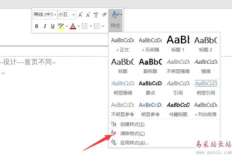 5、然后選擇倒數第二個清除樣式即可刪除頁眉的劃線。頁腳也可采用同樣方法清除
