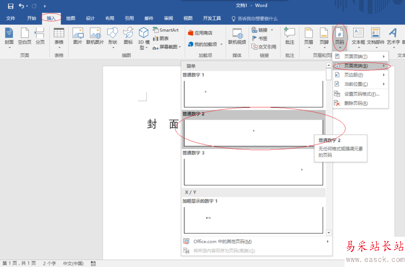 4、接下來(lái)選擇頁(yè)碼的顯示方式。再次點(diǎn)擊"頁(yè)碼"向下箭頭,選擇"頁(yè)面底端→普通數(shù)字2"。
