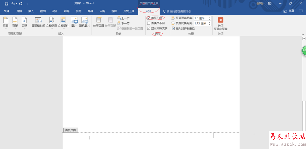 5、點(diǎn)擊"設(shè)計(jì)→選項(xiàng)"功能區(qū),勾選"首頁(yè)不同"。這樣就完成了封面不顯示頁(yè)碼的制作,大家不妨試試。