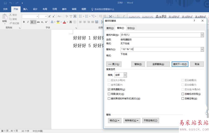 4、查找內容輸入"[0-9]{1,}"、替換為輸入"^32^&^32",勾選"使用通配符"。