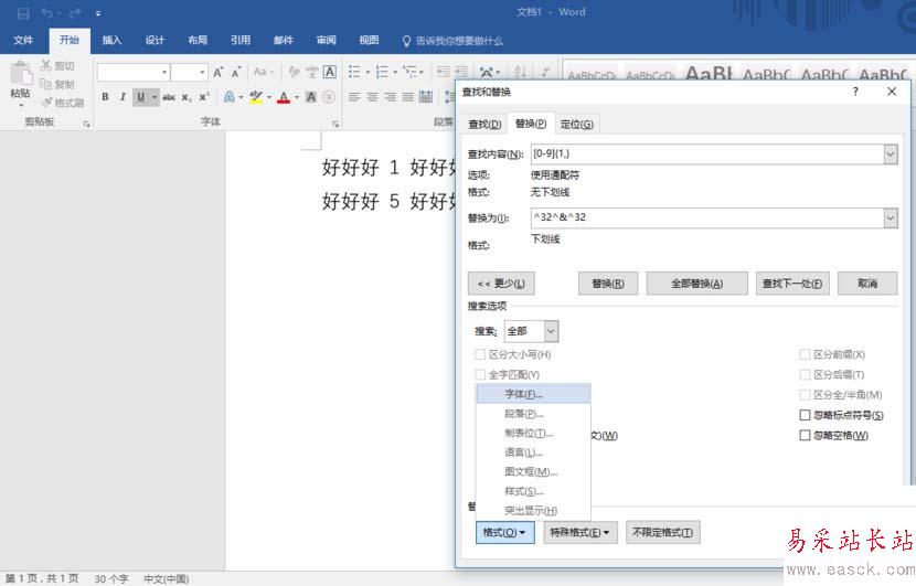 5、點擊"替換→格式"向下箭頭,選擇"字體"。