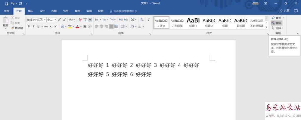 3、點擊"開始→編輯"功能區,選擇"替換"。