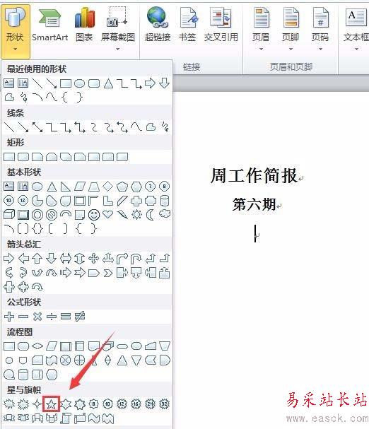 6、點(diǎn)擊形狀選項(xiàng)再在下拉菜單里找到星與旗幟選項(xiàng),在其內(nèi)找到五角星形選項(xiàng),如圖所示: