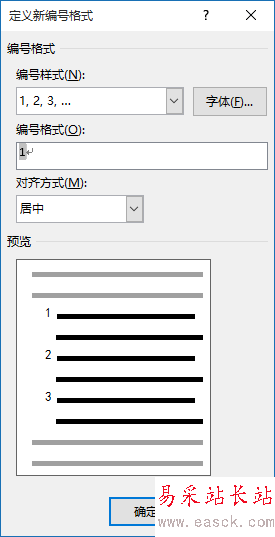 3、接著,在彈出“定義新編號格式”窗口,將第二項“編號格式”中的數字1后面的點去掉,就是留下純數字1;