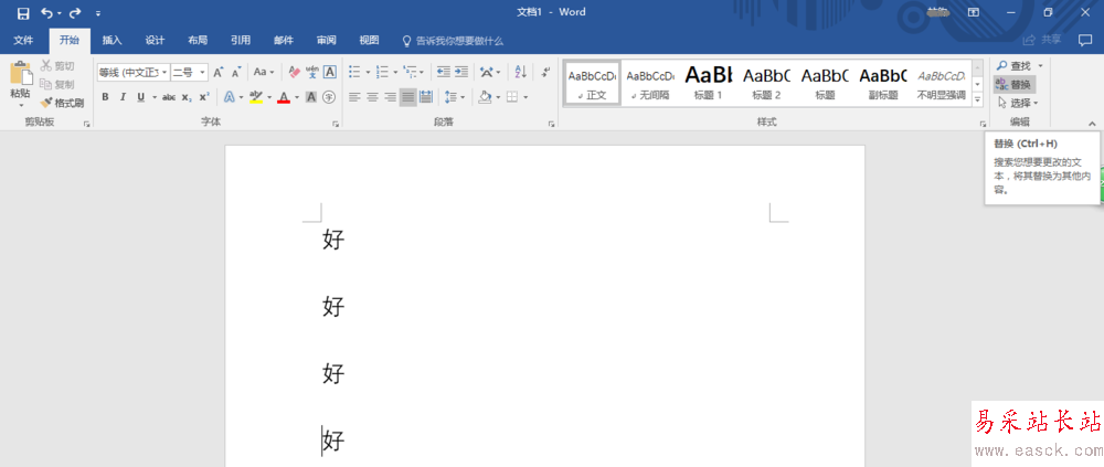 3、點擊"開始→編輯"功能區,選擇"替換"。