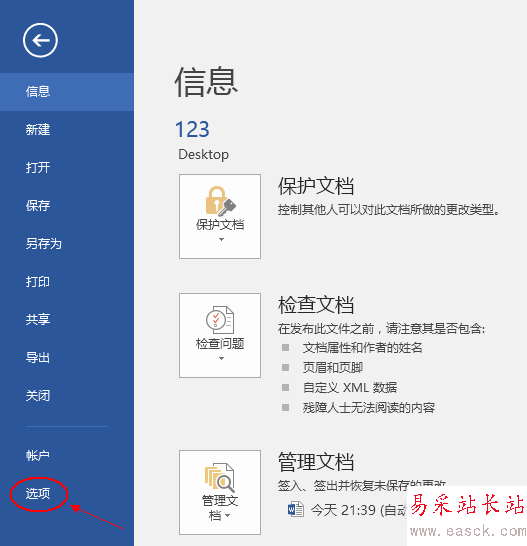 2、進入“文件”選項之后,會出現如下菜單,再選擇最后一項“選項”。