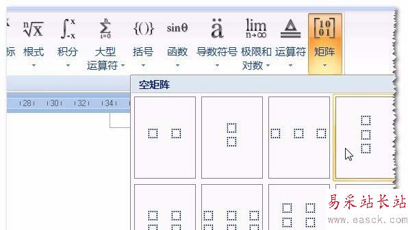 5、完成了第一個(gè)部件,到第二個(gè)了。按一下鍵盤向右的箭頭,使編輯光標(biāo)在第一模板右邊。細(xì)看,這是一個(gè)含有上中下三個(gè)位置的矩陣。所以,在“矩陣”命令中選擇對(duì)應(yīng)的矩模板。