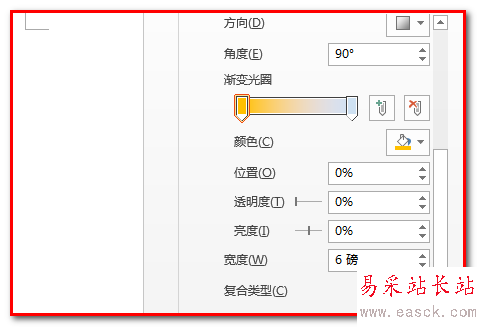 4、下方彈出設置漸變邊框的各項;現在設置漸變的顏色,比如,設置圖片邊框漸變顏色為淡黃到紅的漸變,鼠標點漸變光圈的左邊色塊,選擇黃顏色,