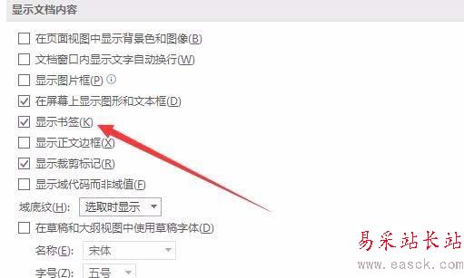 4、在打開的窗口中選中“顯示文檔內(nèi)容”下面的“顯示書簽”前的復(fù)選框