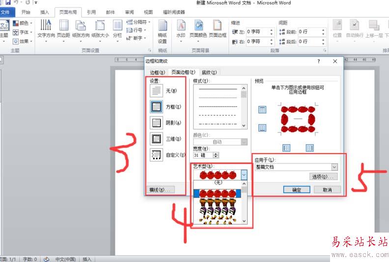 2、按步驟選擇邊框,藝術型根據自己喜好選擇,要注意滴5項,看看是否應用于整篇文檔還是當前頁面